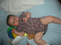 This past Tuesday we had dinner with some friends, two of whom have babies pretty close in age to Natalie. Until this dinner, I thought that Natalie was big. I mean, she has been growing like crazy, her legs are so long and she has doubled her birth weight. These two other babies made me realize that Natalie is a petite girl. I guess each baby grows at their own pace, they are all about the same length – but these babies each outweigh Natalie, by a few pounds! I wonder if this is a predictor of the future….tall and skinny?
